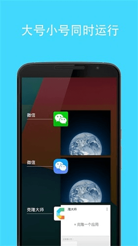 鍏嬮殕澶у笀锛圕loneMaster锛夋槸涓娆捐兘澶熻浣犳墜鏈哄簲鐢ㄥ寮鐨勬墜鏈篴pp锛屽叾鍘熺悊灏辨槸璁蹭綘鎸囧畾鐨勫簲鐢ㄥ崟鐙敓鎴愪竴涓皬鍙凤紝浠庤岄伩寮鎵嬫満绯荤粺鐙珛杩愯銆傝蒋浠舵敮鎸乹q寰俊浠ュ強鍚勭鎵嬫父锛屾搷浣滅畝鍗曪紝涓嶅崰鍐呭瓨锛岃鎵嬫満瀹炵幇鐪熸鐨勫寮銆備笉鐢宠澶氫綑鏉冮檺锛岃鎮ㄧ殑绀句氦銆佹父鎴忕瓑搴旂敤鐪熸鍋氬埌澶у彿灏忓彿娴佺晠鍒囨崲锛岃交鏉惧弻寮锛屼竴姝ユ悶瀹氥