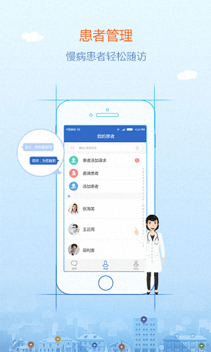 1.实名患者管理:100%实名的患者,通过与你的绑定和签约,可在线浏览和编辑用户的相关信息(个人健康档案管理、个人健康数据录入、就医记录、用药计划及提醒、在线随访、电子病历等);