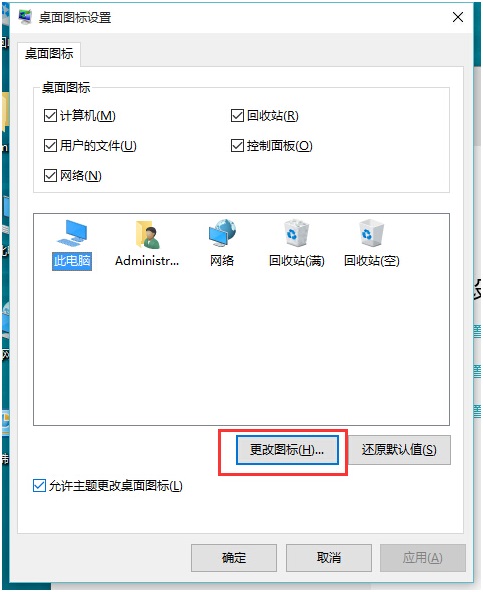 3、在“桌面图标设置”窗口中间选择框里选中需要修改图标的项:比如“网络”,点击“更改图标”网络(勾选“允许主题更改桌面图标”):