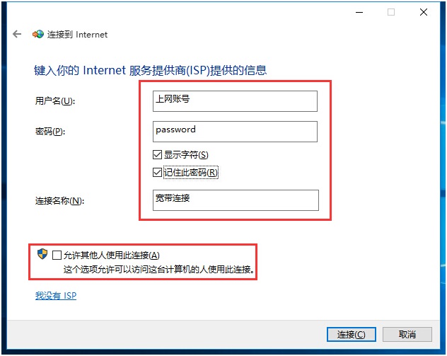 7銆佽緭鍏ヤ笂缃戝笎鍙峰拰瀵嗙爜锛屽嬀閫“璁颁綇姝ゅ瘑鐮”銆傚鏋滅數鑴戞湁澶氫釜鐢ㄦ埛浣跨敤锛屽叾瀹冪敤鎴蜂篃瑕佷娇鐢ㄦ杩炴帴涓婄綉鐨勮瘽锛屽嬀閫“鍏佽鍏朵粬浜轰娇鐢ㄦ杩炴帴”锛屽鏋滀笉璁╁叾瀹冪敤鎴蜂娇鐢ㄥ氨涓嶈鍕鹃夈