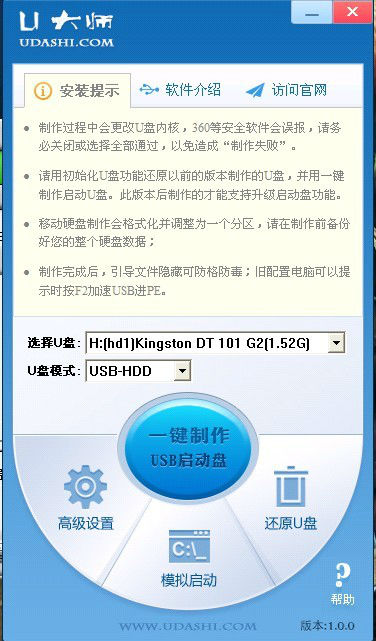 还在为重装系统发愁吗?还在为没有光驱,或是没有系统光盘而烦恼吗?未解决广大计算机用户的烦恼,U大师推出一款制作启动U盘的软件工具——U大师-U盘启动盘制作工具,可完成U盘一键安装系统的制作,可实现GHOST系统备份/恢复,WinPE安装,磁盘分区,内存测试等功能。它具有一键制作,方便快捷、支持各种U盘制作、读写速度快,安全稳固等多种优点,能让你在短的时间内学会并使用U大师启动U盘制作来重装系统。下面就如何使用U大师启动U盘制作做详细说明。
