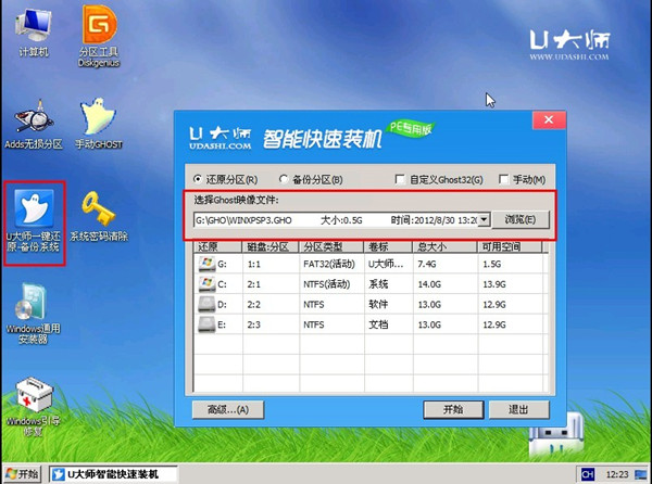 3.双击运行“U大师一键还原备份系统”工具,单击“浏览”,找到刚才准备好的.gho文件,如图:
