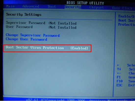 出现上述故障,可能是主板设置问题引起的,原因是主板生产商为了防止病毒侵入引导区文件而特别进行了设置。解决方法就是重新启动电脑,按DEL键,进入BIOS设置,在安全设置(Security)里,找到引导扇区病毒保护(Boot Sector Virus Protection)选Enabled,然后按F10,保存退出,再重新启动电脑即可。另外,在完成分区或格式化后,建议好还是设置成原来的默认值,这对于病毒入侵引导区会起到保护作用。