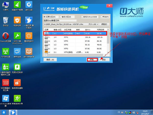 5.选择需要安装的系统分区(这里就以C盘演示),然后单击“开始”按钮。如图: