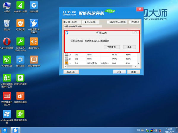 9. ghost系统安装完毕后,会弹出“还原成功”窗口提示电脑将在15秒后自动重启,如图: