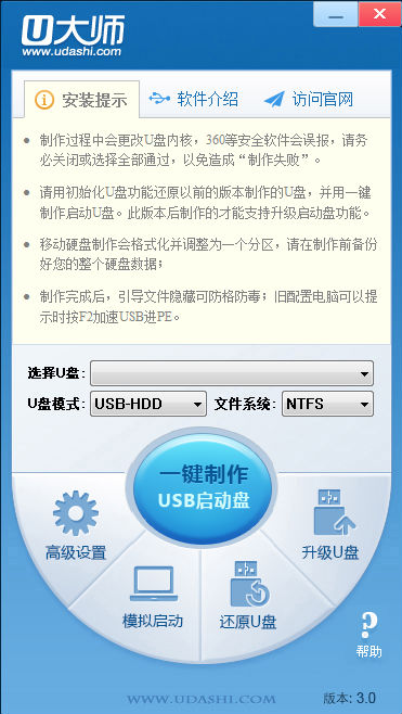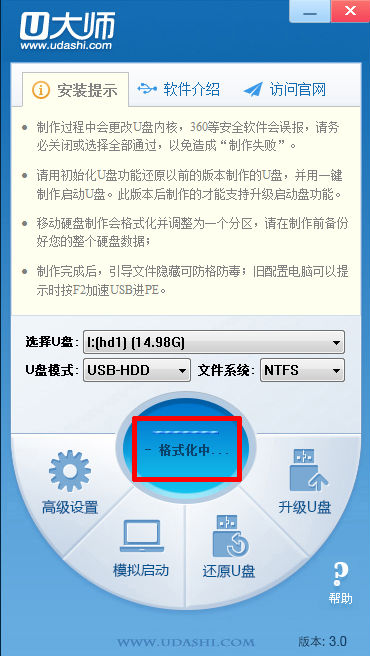 第二步:用U大师“U盘启动盘制作工具”制作启动U盘。