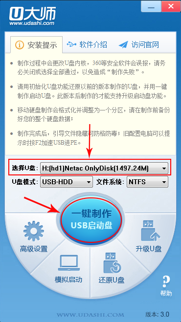 3、安装完成后,弹出U大师U盘制作界面,插入你的U盘,点击一键制作。