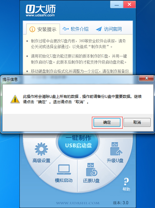 2、点击安装,开始u大师U盘制作启动工具3.0安装。