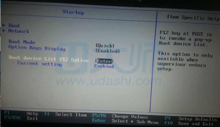 第三步、进入Startup,先找到Boot device List F12 Option,回车,选择Enable,这个步骤主要是为了F12的开启快速设置u盘启动的启用选项,然后往上移动,找到BOOT,回车: