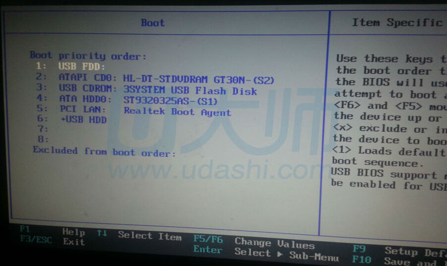 第四步、出现下图界面,利用F6将USB HDD挪到去,然后按F10保存重启: