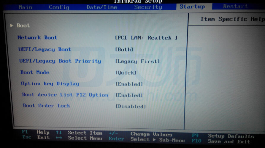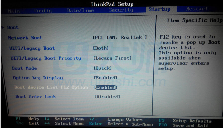 第二步、在bios里找到Startup,找到Boot device List F12 Option,然后回车选择Enable,这个步骤是为了开启F12快速选择而做: