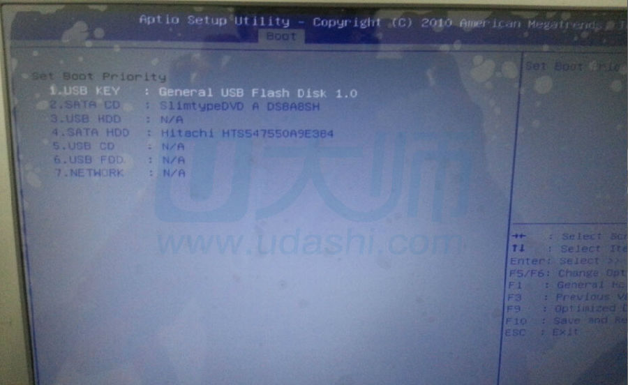 第三步、在boot界面将u盘也就是USB KEY :GENERAL USB Flash Disk 1.0,用F6挪到位置,然后按F10保存退出:
