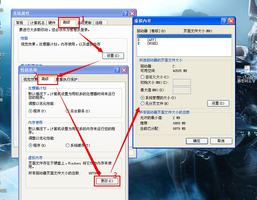 2. 设置虚拟内存。虚拟内存不足也会造成系统运行错误。右键点击“我的电脑”,可以在“系统属性”对话框中手动配置虚拟内存,把虚拟内存的默认位置转到可用空间大的其他磁盘分区,而把默认的系统分区(如C盘)设置为“无分页文件”。