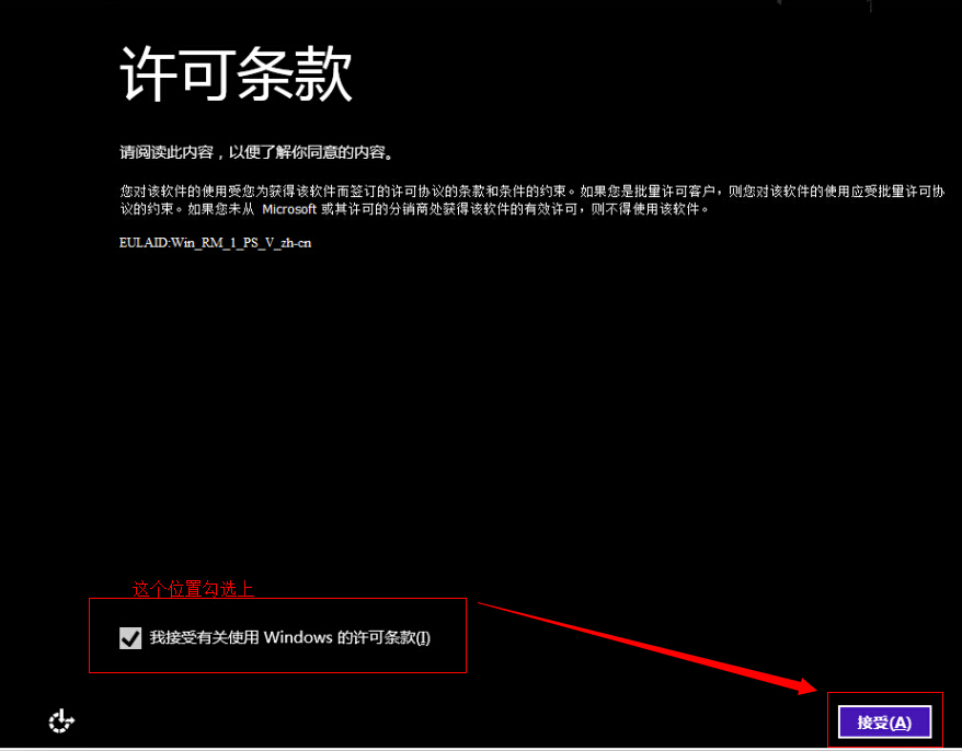 5、然后就是许可条款,在我接受有关使用Windows的许可条款前面的小框打上勾,然后点击接受: