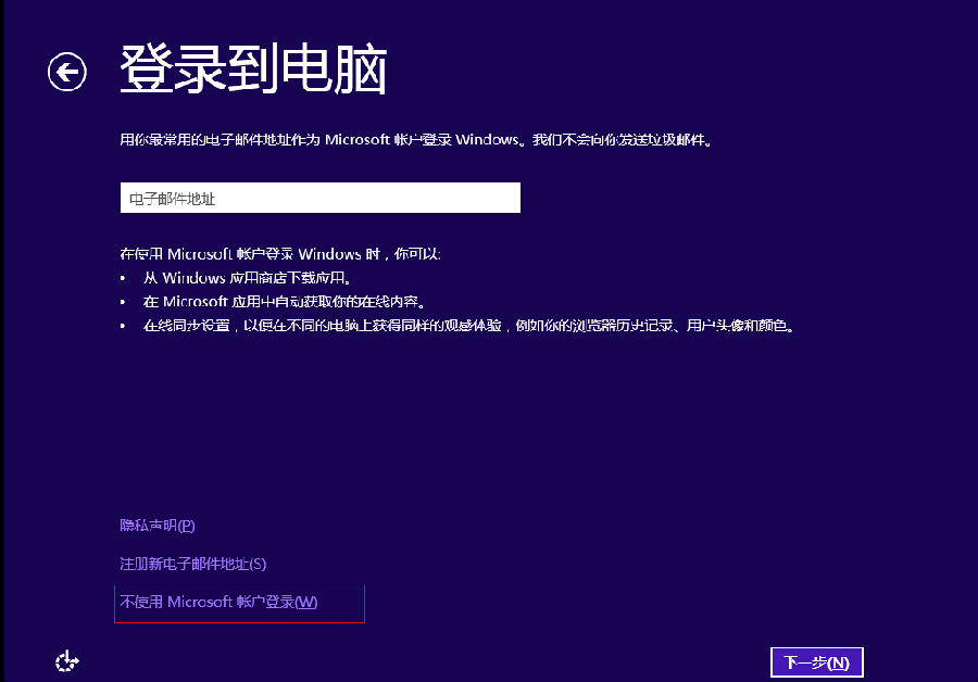 8、在登录到电脑这,选择左下角的不使用Microsoft账户登录,然后点击下一步: