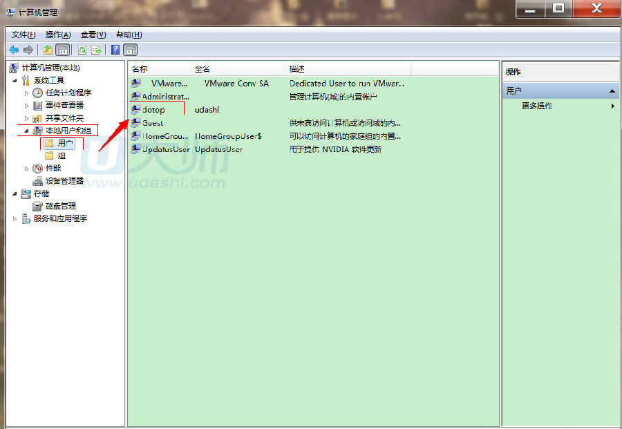 第二步、依次打开本地用户和组--用户--选择要更改的用户帐户,小编的是dotop: