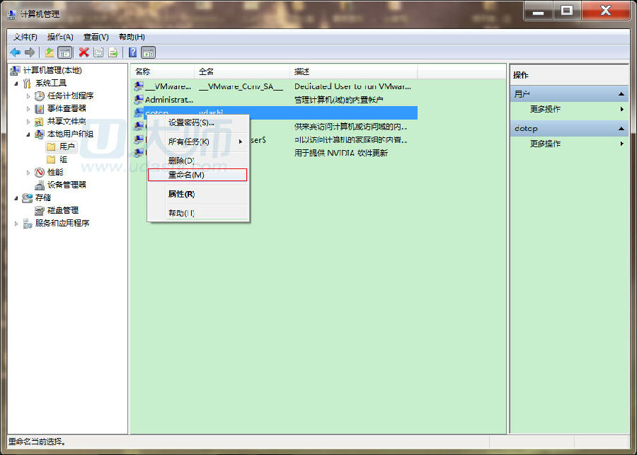 第三步、点击要更改的用户帐户,然后右键,点击重命名: