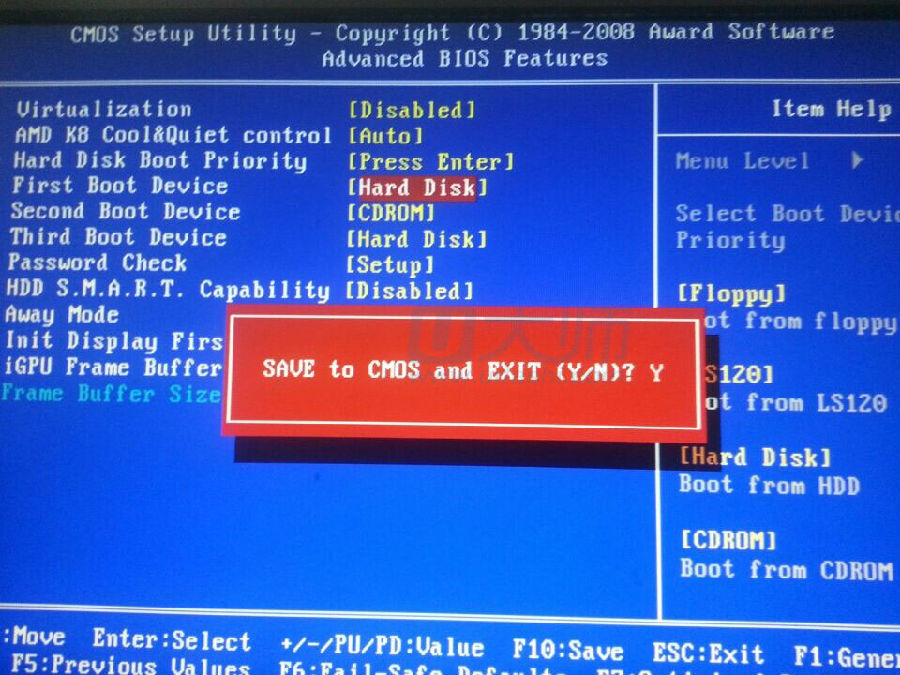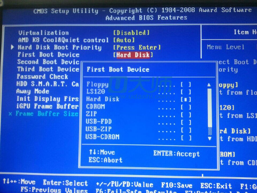 4、然后找到First Boot Device回车,选择hard disk,然后按F10保存,这样就把u盘设置为了启动了: