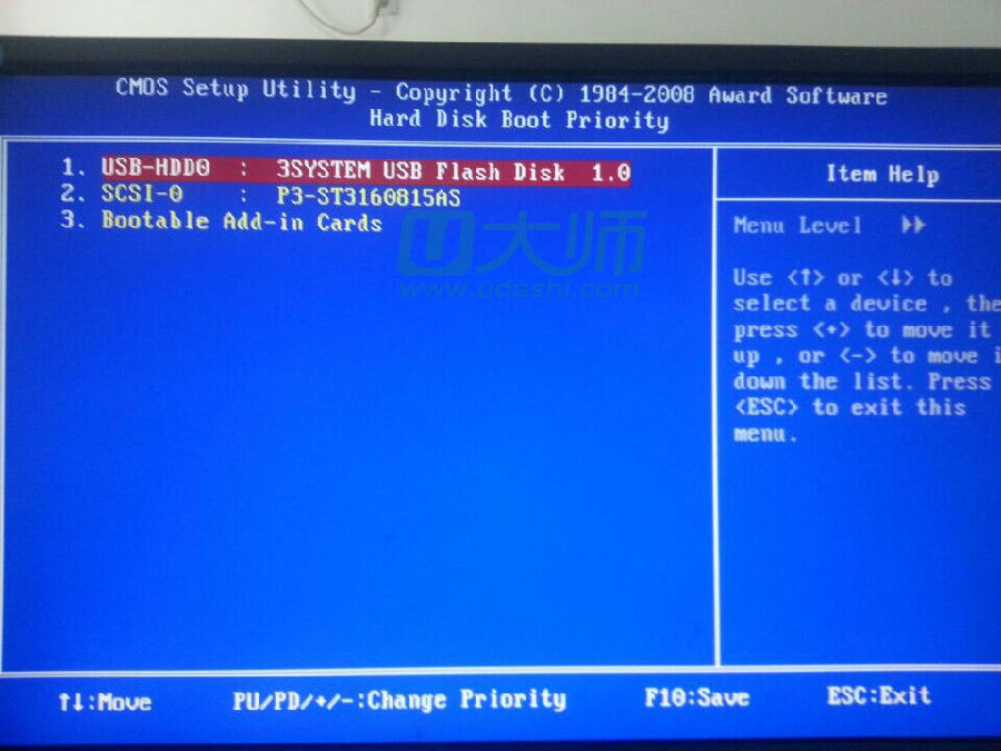3、将USB-HDD这一项用“+”号挪到去,然后按esc返回: