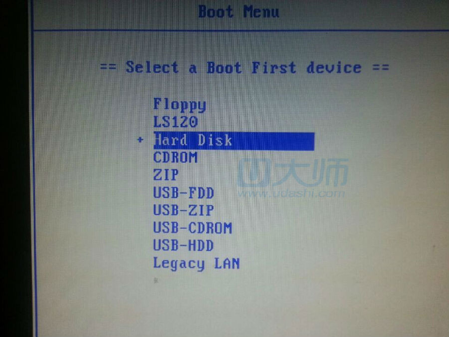 5、或者我们可以直接开机F12(不同品牌的主板不同按钮,具体请参看文章末尾处),出现如下图所示界面,选择Hard Disk,然后回车: