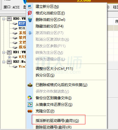 1、重启电脑后进入win08PE,运行分区工具diskgenius,右键点击ESP分区,指定此分区为t盘: