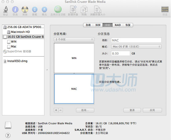 步 、首先在 Mac 下shift+command+u,打开实用工具的磁盘工具,左侧找到U盘,然后重新分区。分区布局中,选择2个分区,个必须是Windows的(如果个分区是mac格式的那么将不会在win下显示),第二个分区我们准备给mac,所以选择Mac os 扩展(日志式)格式: