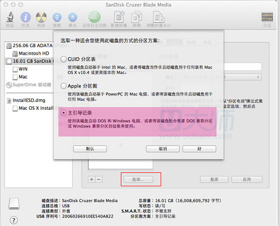 第二步、点击选项,选择主引导记录,这样做是为了能让U盘win部分能在windows下可见,选好后点好: