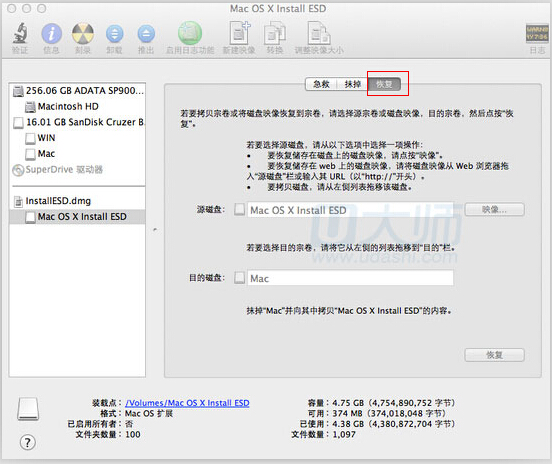 第三步、点击回复,将Mac OS X install ESD用鼠标重左边拖地至源磁盘,然后将U盘的Mac分区通过鼠标拖动至母的磁盘,后点击恢复,花上半个小时时间一个mac的启动盘就制作完成了,后win部分可以继续当存储使用: