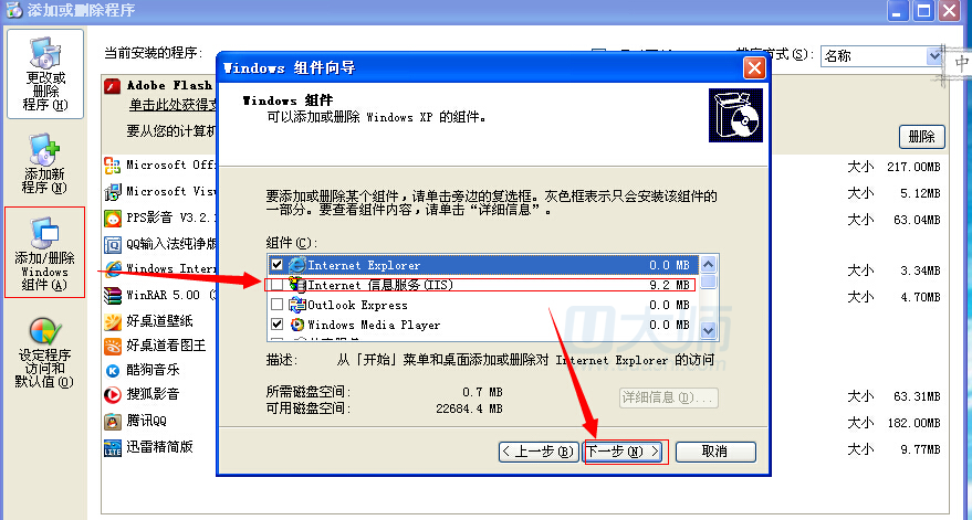 3、然后依次点选添加/删除windows组件--Inter信息服务(IIS)--下一步,安装过程中可能需要一个I386的的插件,读者可以找我们的客服要,是免费的: