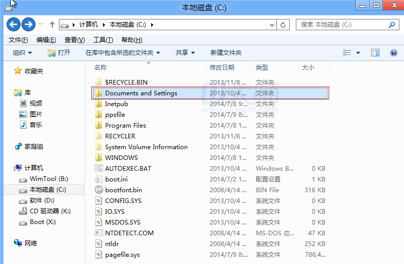 2、找到Documents and Settings,然后点击: