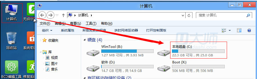 1、在U大师pe下打开计算机,然后点击C盘:
