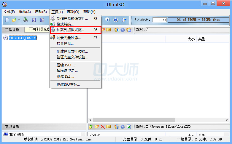 1、打开u大师u盘启动盘制作工具pe系统里面虚拟光驱: