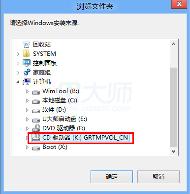 8、在浏览文件夹界面选择CD驱动器(K)GRTMPVOL_CN,然后点击确定: