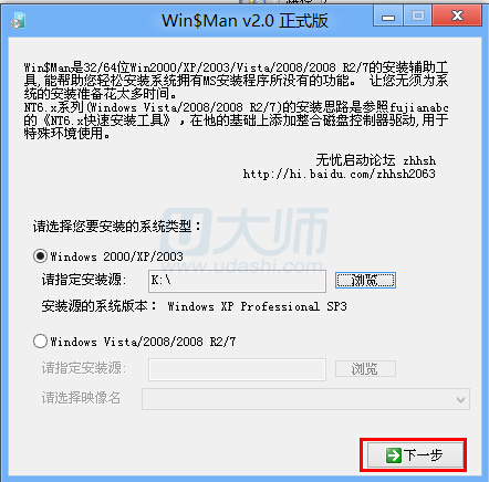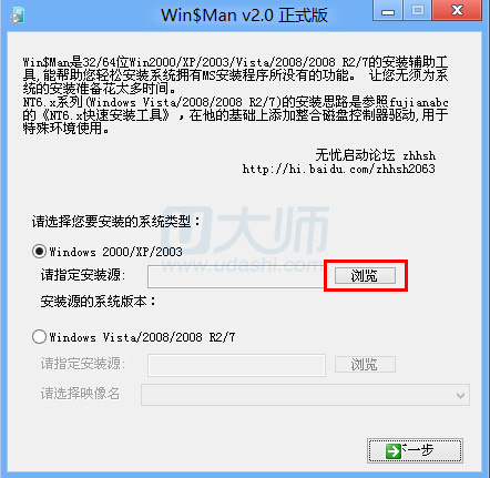 7、在请选择您要安装的系统类型中选择windows 2000/XP/2003,然后点击浏览: