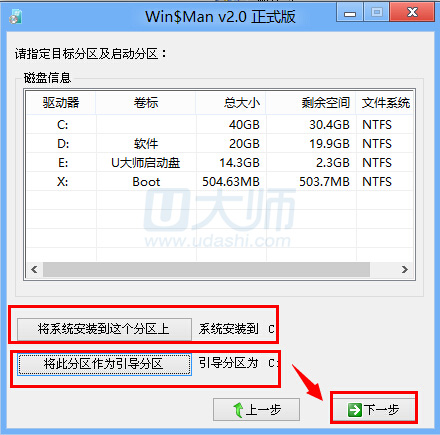 10、在下图所示界面,点击将系统安装到这个分区上,系统安装到C盘,点击将此分区作为引导分区,引导分区为C盘,然后点击下一步:
