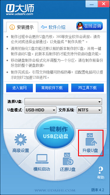 2、然后下载安装u大师u盘启动盘制作工具v4.2,点击升级u盘,这样u盘就自动的从u大师u盘启动盘制作工具的3.0升级到了4.2,过程非常的简单,还没有升级的朋友可以试试: