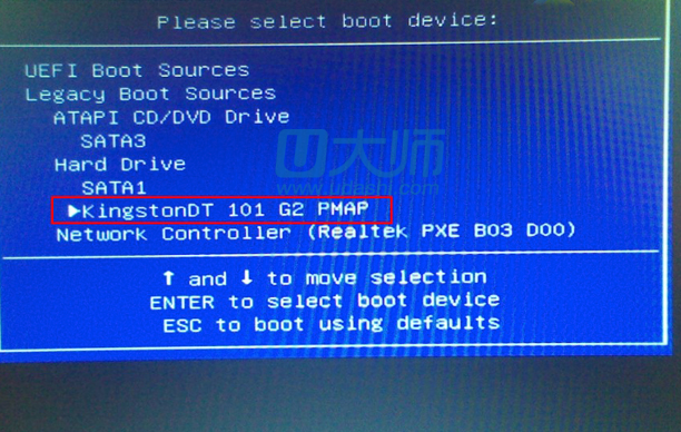 3.这里我们选择u盘也就是KingstonDT 101 G2 PMAP,然后回车即可从u盘启动,其他几项的中文意思分别为: