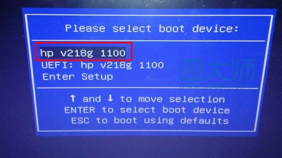 2.然后就可以看见如下图所示界面,选择HP V218G 1100即U盘,然后回车,即可进入到u大师u盘启动盘制作工具的主界面: