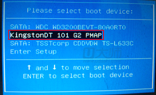2.然后出现下图所示界面,选择KingstonDT 101 G2 PMAP即U盘,然后回车: