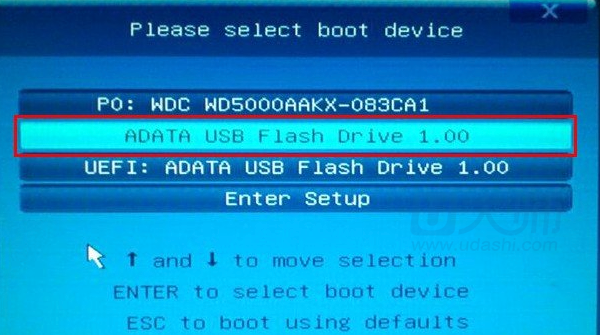 2.见到如下界面后挪动光标选择ADATA USB Flash Drive1.00,然后回车,一般情况下看到带USB的选项那就是u盘了: