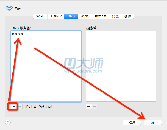 4.点击DNS。点一下左下角的“+”然后输入8.8.8.8,然后点好: