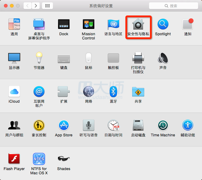 1.打开苹果笔记本电脑的系统偏好设置,点击安全性与隐私: