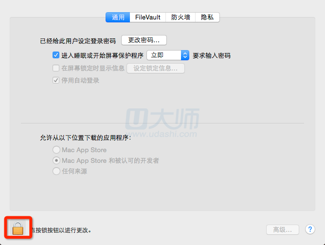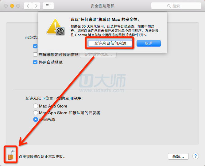 3.然后点击允许来自任何来源,然后点击左下角的小锁: