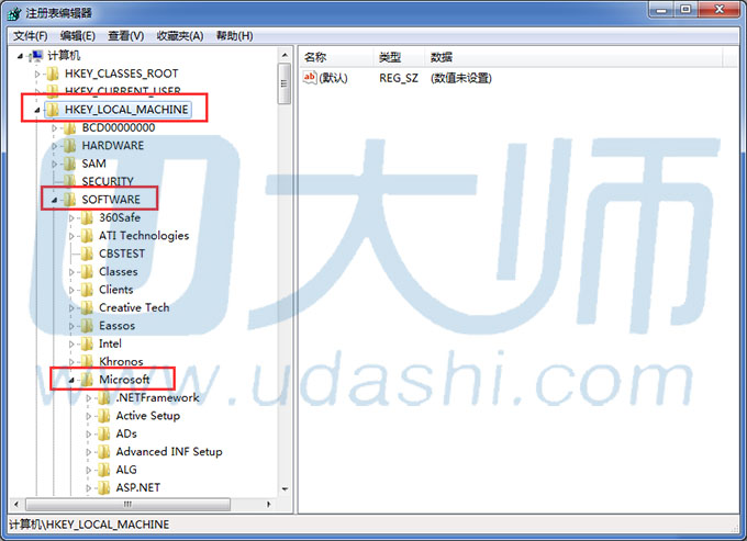 2、在“注册表编辑器”中打开“HKEY_LOCAL_MACHINE”,然后找到里面的“SOFTWARE”,接下来打开“Microsoft”,点开它