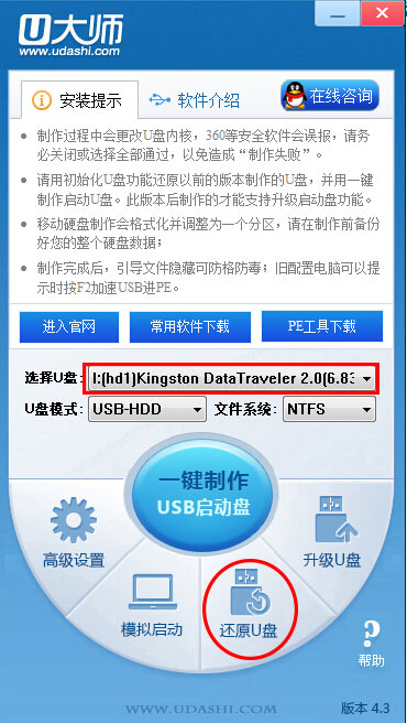 1.点击桌面上“u大师-u盘启动盘制作工具”,插入u盘,在右下角找到“还原u盘”: