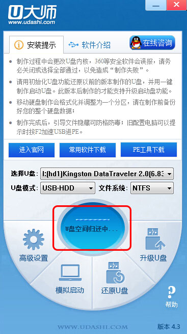 昨天有网友向小编表示,他已经使用u大师u盘启动盘制作工具来给他的电脑重装系统了,现在不需要使用u盘启动盘了,要还原u盘的空间该怎样操作呢?小编给大家分享一个利用u大师u盘启动制作工具,正确安全的还原u盘的空间。