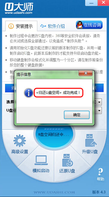 完成这些步骤,就可以很容易还原u盘空间了。需要还原u盘空间的朋友可以操作,希望u大师u盘启动盘制作工具能帮助到有需要的朋友。