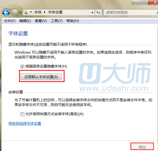 4.在字体设置界面,点击“还原默认字体设置”,再点击“确定”: