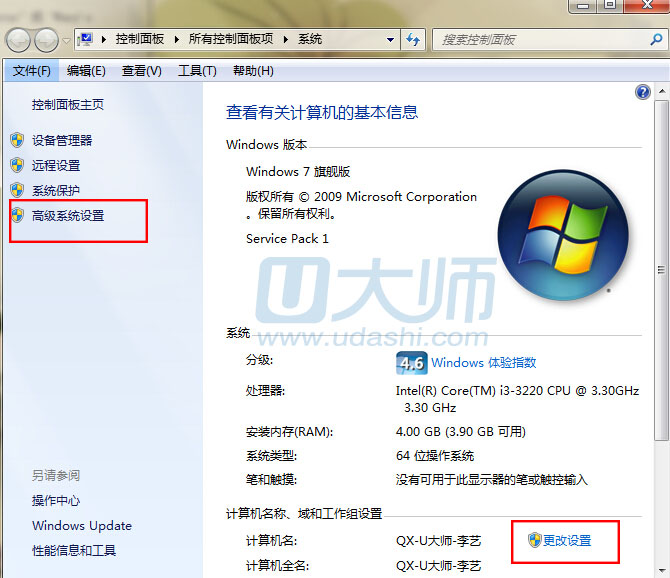 2.在左侧选择“高级系统设置”和右下方的“更改设置”都可以: