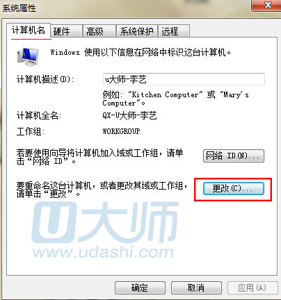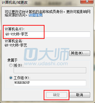 4.接着在弹出窗口,修改计算机名称后点击确定即可,更改设置后重启电脑就可以看见效果了:
